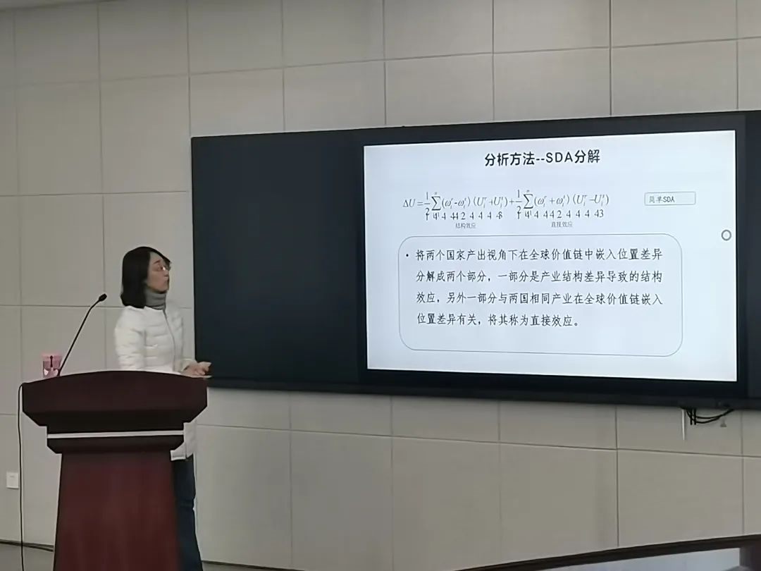 在进行了金融价值链的理论分析后,为了让同学们在未来更好地应用理论,戴老师为同学们讲解了SDA分解的分析方法来处理分析实际数据,将两个不同国家在全球经济链嵌入位置差异分为结构效应和直接效应两个部分,并基于中美两国的嵌入位置差异为同学们现场分析数据,通过对数据的比较,得出了中美两国在全球价值链的距离在逐渐拉大的结论。