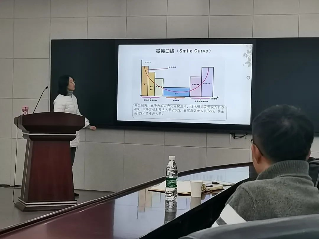 首先,戴老师为同学们普及全球价值链的涵义及作用、国民经济中间消耗的涵义。在戴老师的详细讲解下,同学们对全球经济链的嵌入位置问题有了更好的思考。随后,戴老师运用迈克尔·波特的价值链理论和微笑曲线理论,对企业间、企业内、产品内的分工问题进行了模拟分析,进而推广到对全球价值链的探究中。