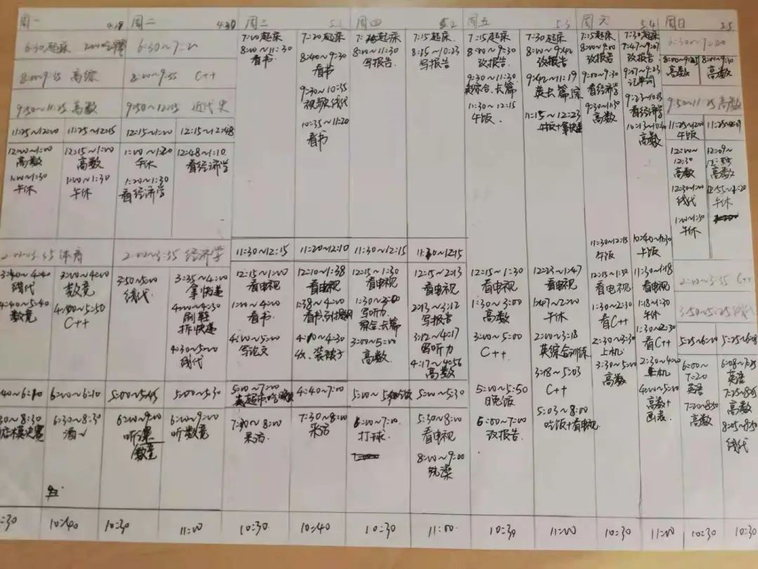 “凡事豫则立,不豫则废。”对于计划的重要性,这里直接引用张畅同学的一段话。“计划肯定是很重要的,小到每日学习,大到人生规划,只有提前构思,整体把握,才能做好充分准备,不走歪路。比如说大学四年,从大一到大四自己要有什么程度上的改变,哪些方面是自己想要发展的,对未来进行初步规划,心中有数,就能在学习、活动、竞赛之间游刃有余,人也会更从容些。日常学习生活的计划也是提高自律能力至关重要的途径。”