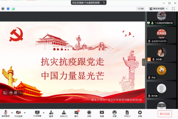 接下来,主讲人以“在‘宁’抗疫克时艰,党员先行显本色”为主题展开介绍。面对南京禄口机场的突发疫情,江宁区一天内完成超200万人核酸采样,全市两天内基本完成第一轮全员核酸采样。这百万数字的背后,让我们见证了战“疫”的“南京速度”,彰显了打赢疫情防控阻击战的中国力量和中国信心。“南京速度”的背后密码,是我国社会主义制度的强大动员力、凝聚力、组织力,是党的坚强领导;是来自广大医护人员、基层干部、社区工作者和志愿者的无私奉献,是一个个默默无闻又闪闪发光的普通市民的积极配合。“哪里任务最艰巨,哪里就有共产党员的身影”,身为党员,我们应当冲锋在前,党员同志要在紧急时刻挺身而出,不懈奋战,让鲜红的党旗在疫情防控一线高高飘扬。