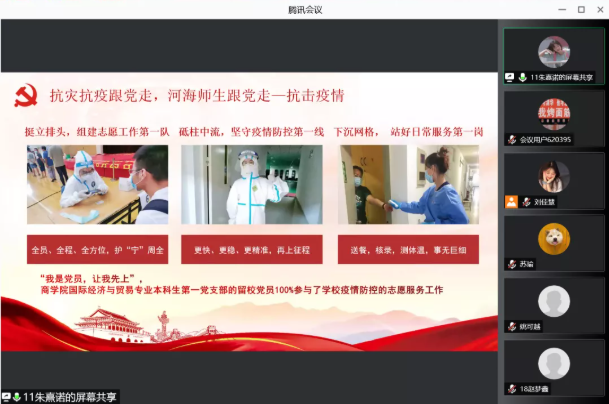 接下来,主讲人围绕本次河南灾情与南京疫情,讲述了河海人“冲锋在前”的责任与担当。河南发生灾情后,我校张珂教授接受中国国际电视台采访谈灾害影响及对策,三级片 2019级本科生王艺雯秉持着“天下有溺犹己溺,此志勿稍迟”的信念,多次联系社区,主动请求到救灾一线,参加抗灾志愿服务活动。河海师生在此次河南灾情中诠释着河海人“天下有溺犹己溺,此志勿稍迟”的使命担当。南京疫情爆发后,河海大学在校师生员工全员争分夺秒、不舍昼夜进行核酸检测,其中,支部的留校党员100%参与了学校疫情防控的志愿服务工作,将“我是党员,我先上”的责任感与使命感落实到了实践中。