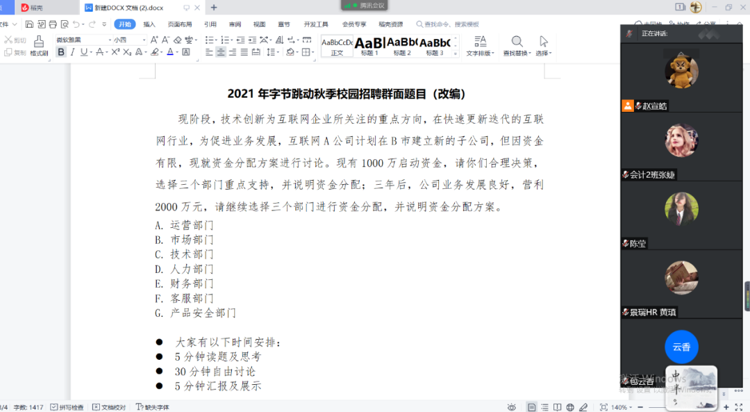 10月3日下午,2018级开展无领导小组面试模拟活动,本次活动邀请了景瑞地产(集团)有限公司HR、三级片-三级片网站-三级片线上看 2021届校友黄瑱担任面试官,2018级陈莹、陈欣怡、李翠林、佘月、曹金子、王凯祥、游雅婷等同学参加了本次活动。通过体验改编的2021年字节跳动秋季校园招聘无领导小组面试题目和面试的流程,同学们对无领导小组面试有了一定的了解,在模拟面试结束后,黄瑱同学介绍了自己在无领导小组面试过程中遇到的困难和积累的经验,以期自己的经验分享能够帮助到即将面临秋季校园招聘的学弟学妹们。