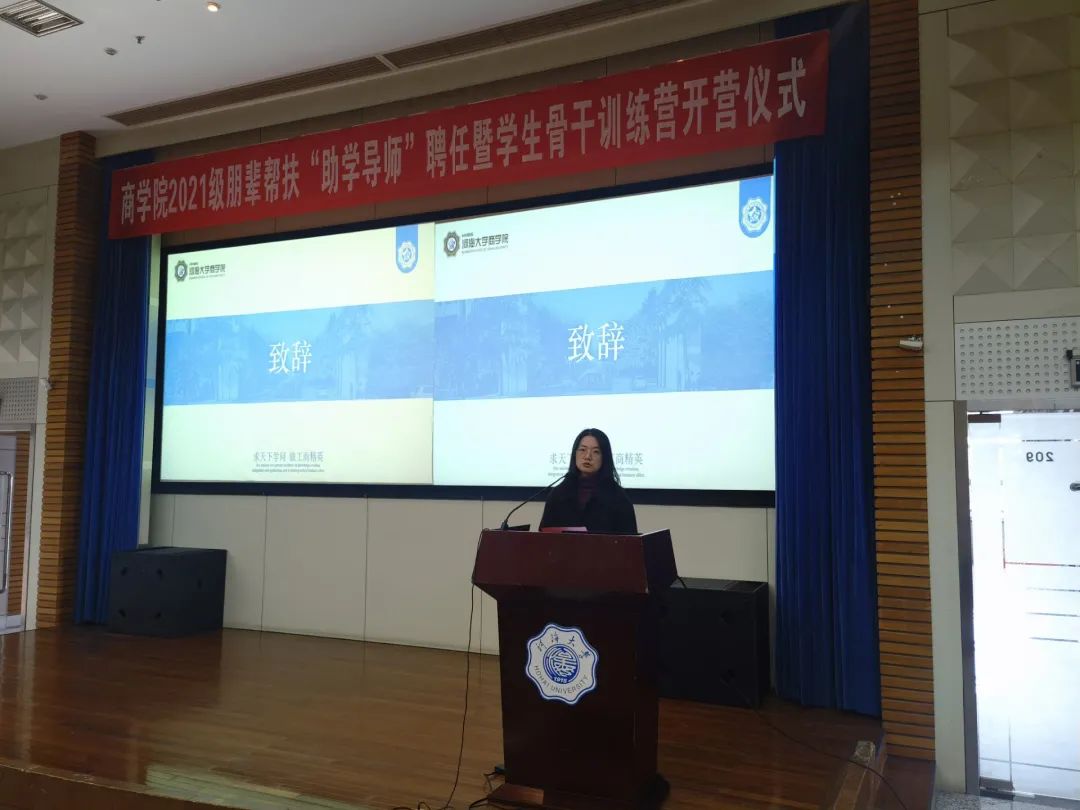 活动第一项议程,学院党委副书记戴媛媛老师致辞。戴书记表达了对助学导师工作的肯定和鼓励,并对学生骨干提出了三点希望,坚定理想信念、夯实学习基础、发挥榜样示范。戴书记勉励新生学生骨干,既能仰望星空,又能脚踏实地,努力成为具有社会责任感的商科人才。