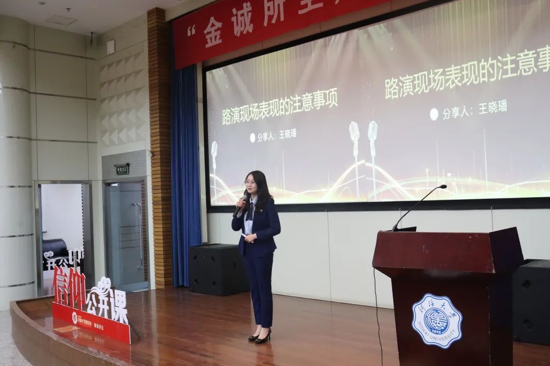 启动仪式第三项,在各大创新创业赛事以及商赛中取得优异成绩的同学进行现场路演与经验分享。第一位为同学们分享经验的是三级片 MBA学生王晓璠,她所在团队的项目——“蓝鲸号”水下机器人在MBA创业大赛中获得全国八强的好成绩。曾获“互联网+”全国银奖的李沁如同学也为同学们带来了一场精彩的现场路演,李沁如团队的项目——“崇新数字”同样致力于解决市场痛点,这样一款基于“区块链+AI智能合约”的数字文化产品交易分发一站式平台具有“用户上传即存证确权,维权更便捷智能,定价有参考”等技术亮点,现已获百万天使投资,并与20余家企业进行了合作。曾获“挑战杯”“互联网+”省赛二等奖的梁岚同学分享了她所在团队的项目,该项目深耕国家政策,关注民生福祉,致力于解决渔民的民生难题。在三位同学讲解完创新创业赛事后,杜佩恒同学为同学们分享了他对ERP沙盘大赛的想法。最后,李林同学为同学们带来了危机公关大赛的经验分享。