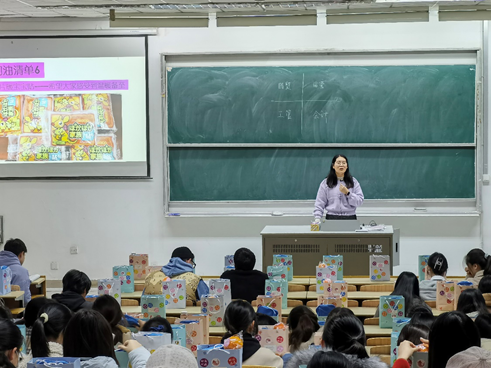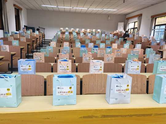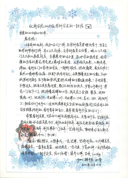 孙菁老师还为同学们介绍了学校和自己精心准备的考研加油包。加油包中共有7样物品:一包安全防疫用品,为同学们的安全保驾护航;一包文具用品,希望同学们在考场上下笔如有神;一袋坚果,希望大家带着信仰坚持到底;一个惊喜盲盒,希望大家好运连连;一颗橙子,希望大家心想事成;几片暖宝宝贴,希望大家感受到温暖备至;一封孙老师的手写信,希望大家带着祝福信心倍增。