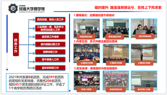 学院传媒中心主任郑雨欣分享了学院传媒中心立足于“HHU商院青年”新媒体平台,在新闻稿件编辑、学生活动报道以及先进典型宣传等方面取得的工作成果。2022年度,学院传媒中心将以做好美育工作为重点方向,在严把意识形态的基础上,立足自身特色职能,通过宣传培训等方式,把以美育人、以美化人、以美培元的工作目标落到实处。