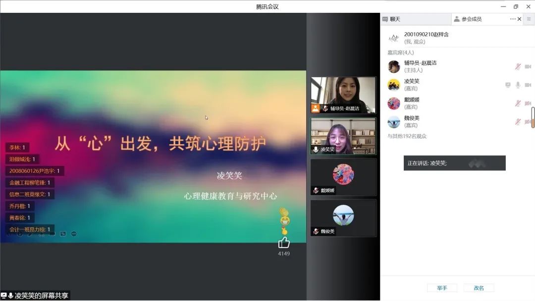为积极响应河海大学第十一届“3·20心理健康周”主题教育活动的精神,引导同学们树立“珍爱生命、心向阳光、砥砺前行、共创未来”的理念,更好地指导心理委员、宿舍长带领班级学生开展心理健康教育活动,三级片 于4月1日下午16时开展了线上心理委员和宿舍长素质能力训练营。本次活动邀请到心理健康与教育研究中心专职心理咨询师凌笑笑老师为主讲嘉宾,学院党委副书记戴媛媛老师和各年级辅导员老师出席本次活动,三级片 全体心理委员、宿舍长们共同参与本次讲座。活动由2020级本科生辅导员赵晨洁老师主持。