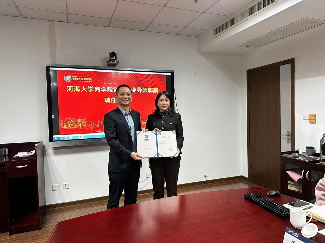 院长助理李婕为郭鹏颁发创新创业导师证书