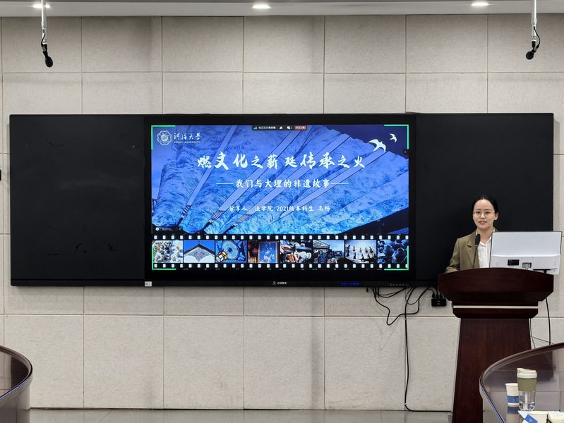 第十八届“挑战杯”江苏省一等奖作品《“非遗进校园”优化路径探究——基于大理市130所小学的调查》的项目负责人法学院高畅同学,从团队合作的角度出发,详细阐述了团队成员在备赛期间分工与协作情况,如何更高效合力打磨调研报告。