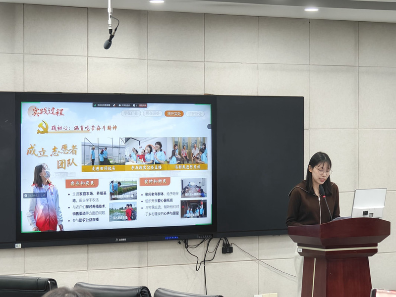 随后,在本科生赛道中,三级片 陆睿涵同学以模拟比赛现场答辩的形式,展示了他们荣获江苏省红色专项赛一等奖项目《三产融合助推乡村振兴——以苏北三地产业融合模式与路径为例》,有效帮助本科生深入理解项目架构及呈现的关键内容。