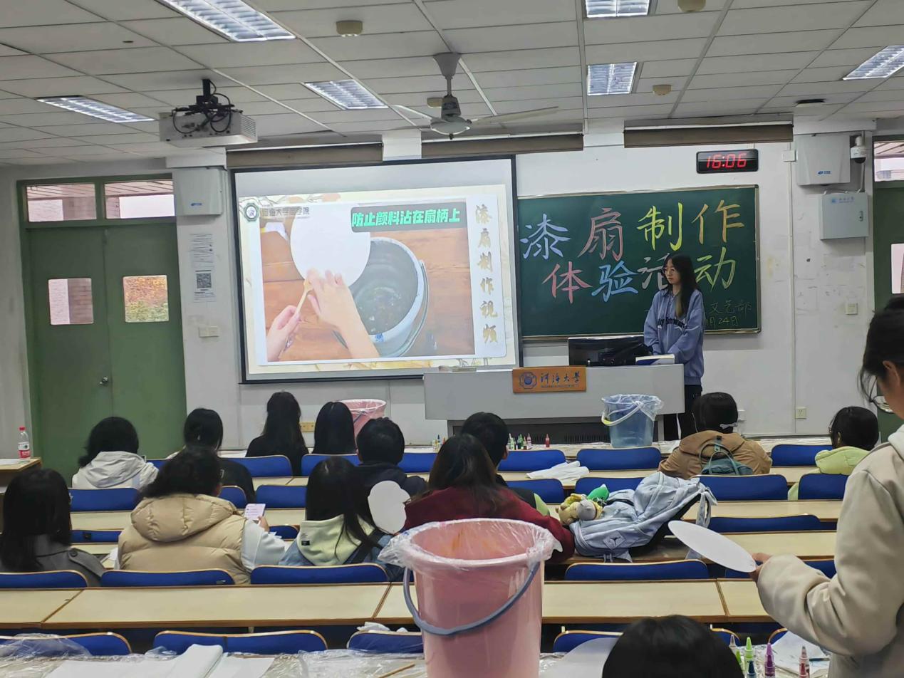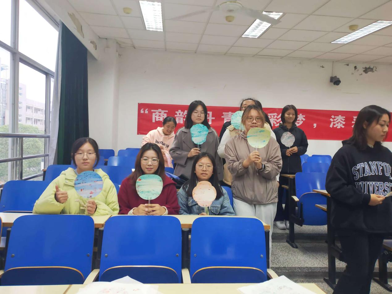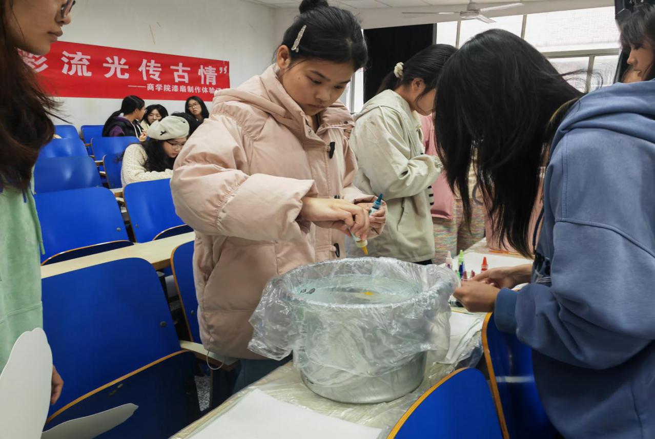 流光定格,摇曳于扇面之上的点点漆色,似山峦似星云似草甸,诗情画意便随着流动的色彩一起跃然纸上。为丰富同学们的精神文化生活,激发同学们对中华优秀传统文化的热爱,三级片 学生会文艺部举办以“商韵丹青绘彩梦,漆彩流光传古情”为主题的漆扇制作活动,分别于11月22日和24日在金坛校区2号楼B113和江宁校区致用楼302顺利举行。本次活动为商院学子提供了一个绝佳的体验平台,在创作过程中近距离感受传统工艺的魅力,学习我国优秀的传统文化,为传统技艺的传承注入新的活力。