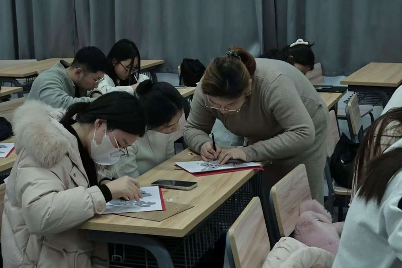 在实践环节,同学们在何老师的耐心指导下,投入到“中国地图”刻纸的制作过程中。大家拿起刻刀和纸张,从最基本的线条勾勒开始,小心翼翼地在纸上雕琢。尽管是初次尝试,手法略显生疏,但同学们全神贯注,努力将何老师所传授的技巧运用到实践中。每一刀的刻画都凝聚着专注与执着,大家在亲身体验中感受传统手工艺的独特韵味,体会到非遗传承人的匠心精神。
