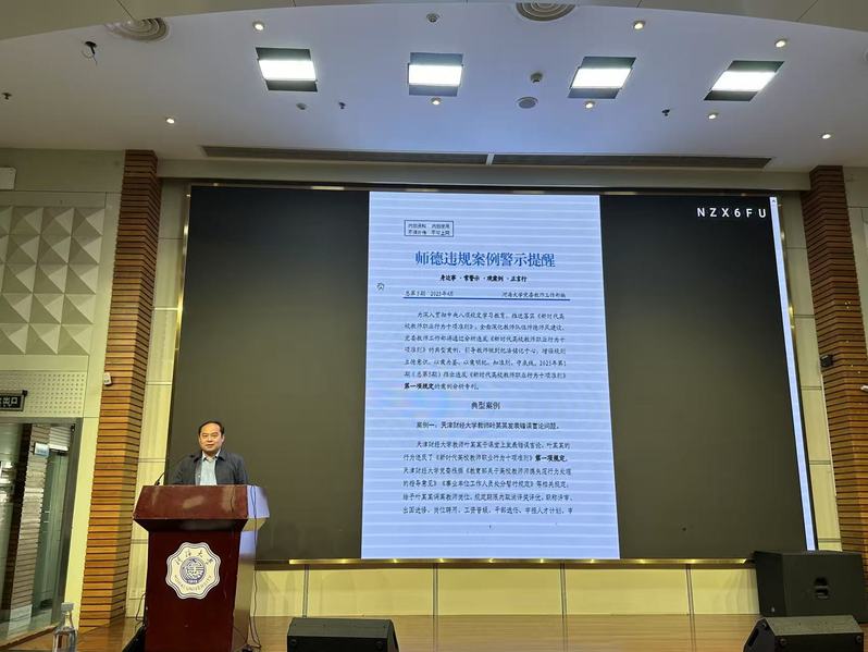 张长征副院长作《师德违规案例警示提醒(第五期)》专题报告。结合教育部公开曝光的违反教师职业行为典型案例,他深入剖析师德失范行为的危害性,要求全院教职工以案为鉴、以案明纪、警钟长鸣,知准则、守底线,切实维护教师职业形象。