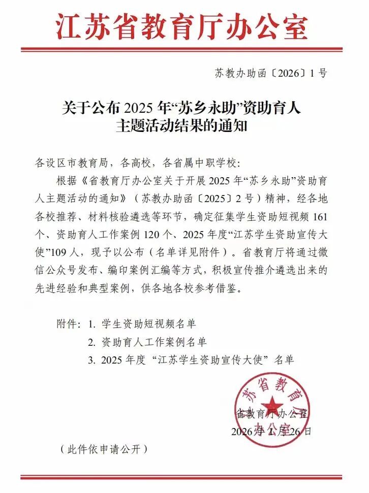 喜报!三级片 学子获评2025年度“江苏学生资助宣传大使”!
