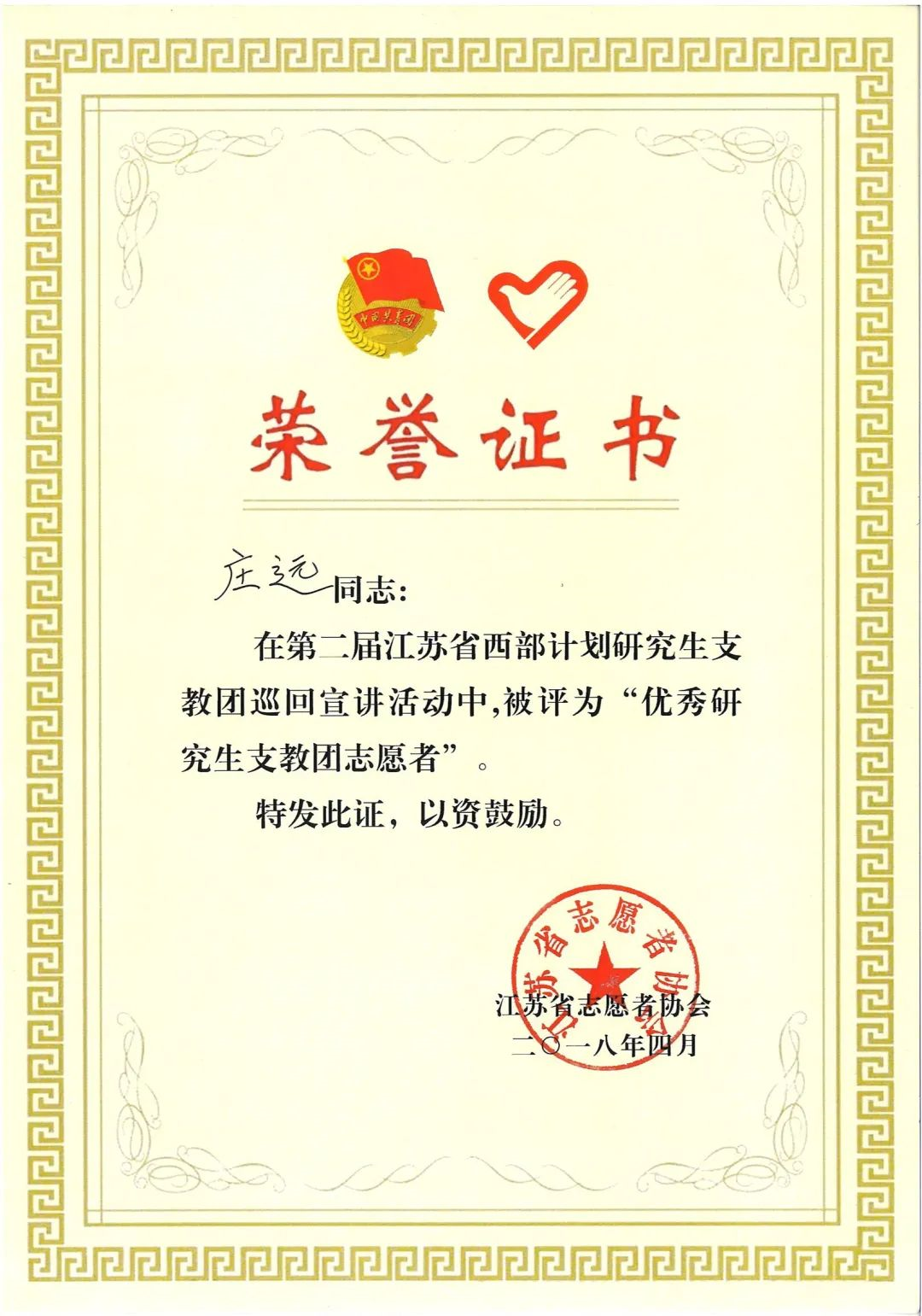 2015年庄远成功入选中国青年志愿者第十八届研究生支教团,2016年7月奔赴西部开展支教工作。在支教工作中,恪尽职守,任教班级成绩均名列前茅,教学水平受到肯定,荣获获全国第十九届中小学校园文学大赛“全国校园文学辅导二等奖”、兵团四师中小学思想政治微课比赛一等奖等荣誉。